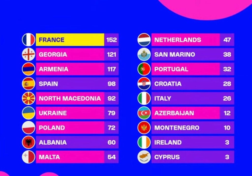 საფრანგეთმა ჟიურისგან 152 ხმა მიიღო, ხოლო ონლაინ ხმებით – 96 ქულა.